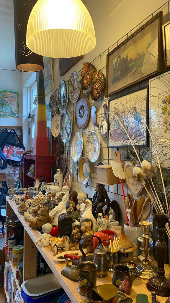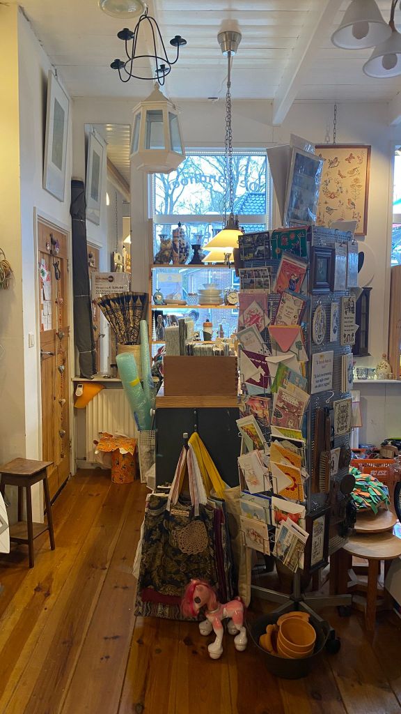 Hier zo zittende is het haast niet voor te stellen dat men vroeger in deze ruimte woonde. Het winkeltje is gezellig ingericht en tijdens mijn gesprek met Irma lopen er verschillende mensen in en uit. Eén van de bezoekers komt een doos oude Lp’s brengen en koopt voor zichzelf een stuk Aleppo-zeep. Ook loopt er iemand rond opzoek naar een cadeautje. Er is namelijk van alles te koop in het winkeltje. Servies, beeldjes, wandversiering, boeken, spelletjes, zelfgemaakte tasjes, sjaals, Aleppo-zeep, aluindeodorant, plantenstekjes, kaarsen, kaarten en nog veel meer. Als je iets komt kopen dan zal Irma dit met liefde inpakken met gerecycled verpakkingsmateriaal. Maar het wordt al snel duidelijk dat mensen niet alleen maar komen brengen of kopen. Sommige mensen komen gewoon voor een praatje. Even goeiedag zeggen.