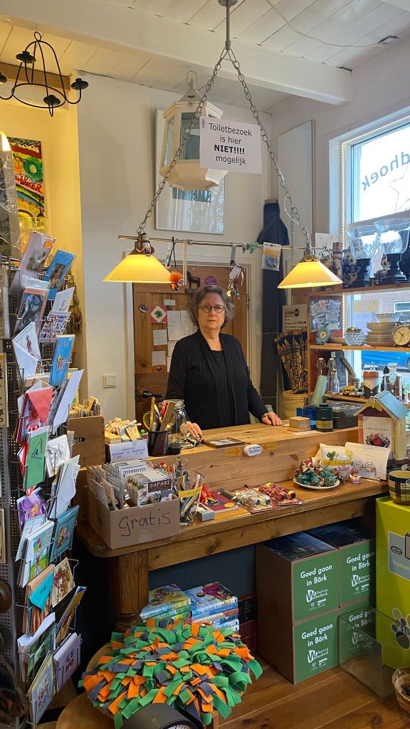 De fooienpot en opbrengsten van de inbreng van recyclebare producten vinden altijd een weg naar goede doelen zoals Stichting Hulphond of Stichting Hertenkamp Westerbork. Irma’s hart voor dieren is enorm en toen ik vroeg waarom ze structureel een bijdrage geeft aan het hertenkamp was haar antwoord: “omdat ik eigenlijk het liefst zelf ook een vrijwillige verzorger was geweest”. Iedere dag loopt Irma met haar rollator voorafgaande de opening en na de sluiting van de winkel met haar drie hondjes over het verharde pad langs het hertenkamp. We zijn het met elkaar eens dat het mooi zou zijn als dit pad een “rondje om het hertenkamp” kan worden…Door fibromyalgie, artrose en vestibulaire migraine is Irma misschien tot veel dingen niet in staat. Mede hierdoor kan het zijn dat de winkel een enkele keer onverwachts niet geopend is. Dit probeert zij altijd via haar facebookpagina te communiceren. Ze mag trots zijn op alles dat ze wél mogelijk heeft gemaakt.